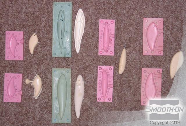 To create the casting, Cast Magic™ pearlescent powder is brushed into the mold. The mold is closed, and Feather Lite™ low density lightweight urethane is poured into the mold. After the Feather Lite™ cures, the mold is opened and the cast lure is removed. The lure can then be painted before use.