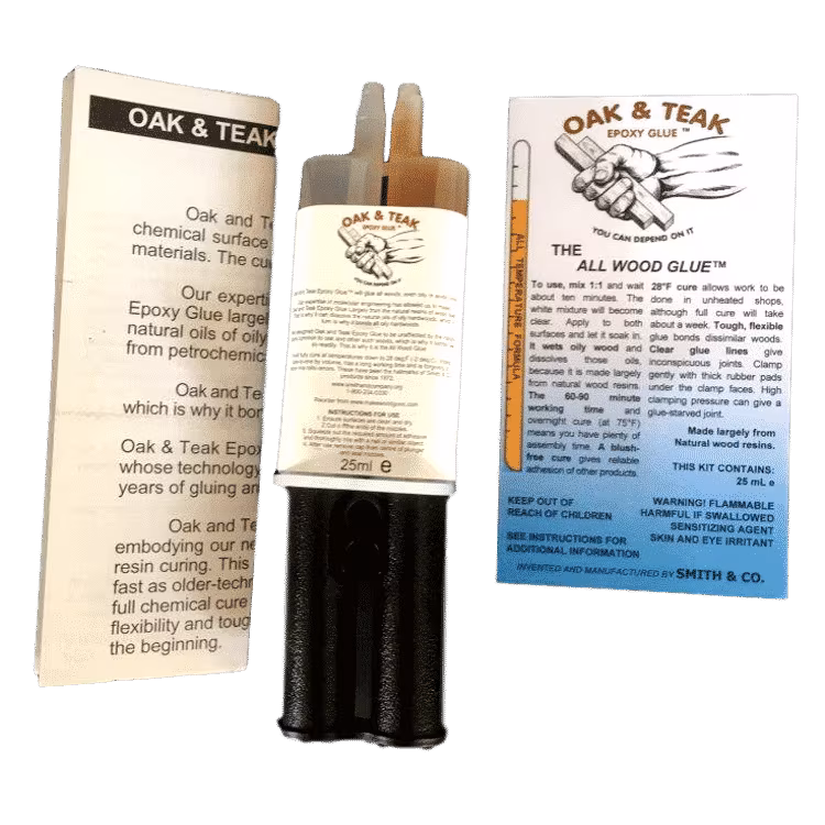 Oak and Teak glue, the all wood glue, is a two part epoxy resin made largely from the resins of wood itself. That is why it can dissolve the natural oils of oily hardwoods such as Teak, Cocobolo and Ebony. Epoxy glues made from petrochemicals cannot bond these oily woods properly.