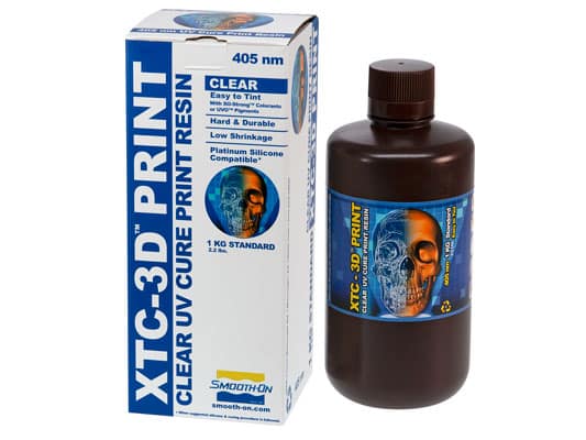 XTC‑3D™ PRINT is a clear general-purpose UV cure 3D print resin. The resin can be printed with any SLA, LCD, or DLP printer that uses a light source in the 365-405 nm frequency range. XTC‑3D™ PRINT has a viscosity of 150-200 cps, is fast printing (3.5 seconds per layer), and is capable of holding very fine detail with high accuracy and minimal shrinkage. XTC‑3D™ PRINT is easy to tint with SO‑Strong™ colorants or UVO™ pigments and has a low-odor formula. When printed, it forms a hard & durable 82 shore D urethane resin. XTC-3D™ PRINT has a high printing success rate. Fully post-cured XTC‑3D™ PRINT is also platinum silicone compatible when a suggested silicone & proper post-cure procedure is followed.