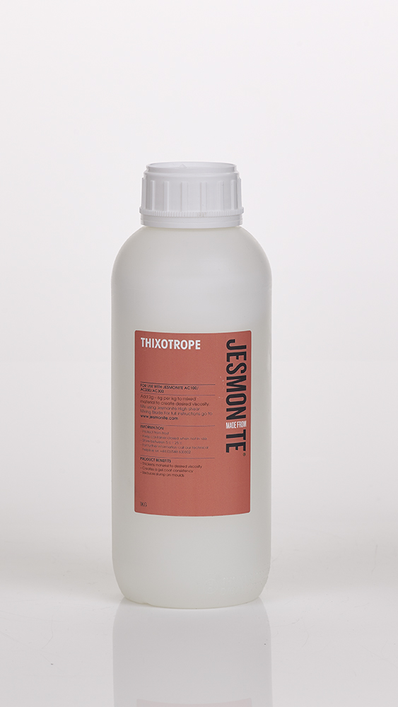 Thixotrope is added so that the viscosity of Jesmonite can be adjusted to the users preference. This is particularly useful when applying a Gel Coat into a mould. By adding Thixotrope it is possible to apply a controlled 1mm – 3mm layer of material without it running off the mould surface. This also prevents glass reinforcements from showing at the face of laminated objects. Thixotrope can also be used to make the material into a paste, which can be used as a repair filler, and jointing paste for bonding two laminates together.