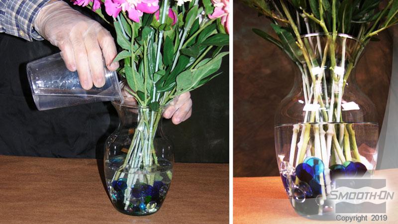 Pouring – Push back flower stems and pour mixture directly into the vase until desired level is reached. Do not let mixture touch side of vase. If using a deep vase or pouring at a difficult angle, pouring Encapso™ K mixture using a funnel may be beneficial. Reposition flowers to a final arrangement and allow material to cure at least 16 hours at room temperature before handling. Do Not Move Vase For At Least 16 Hours Until Rubber Has Cured.