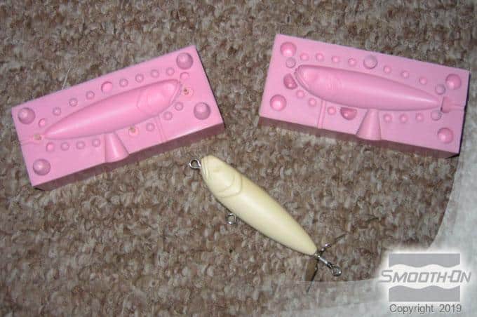 To create the casting, Cast Magic™ pearlescent powder is brushed into the mold. The mold is closed, and Feather Lite™ low density lightweight urethane is poured into the mold. After the Feather Lite™ cures, the mold is opened and the cast lure is removed. The lure can then be painted before use.