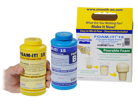 Smooth-On’s FOAM-iT!™ Series are two-component water blown rigid foams that are versatile and easy to use. FOAM-iT!™ products are available in 3lb., 4 lb., 5 lb., 8 lb., 10 lb.,15 lb. or 26 lb. per cubic foot densities. Parts A and B are measured and mixed in equal amounts by volume. The mixture is then poured into a mold or other form (apply release agent if necessary). The mixture will expand many times original volume (depending on which FOAM-iT!™ product you are using) and develop a uniform cell structure. FOAM-IT!™ 15 is tack-free in about 4 – 6.5 minutes, developing handling strength in 20 minutes and full cure in 2 hours.