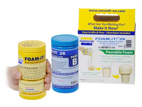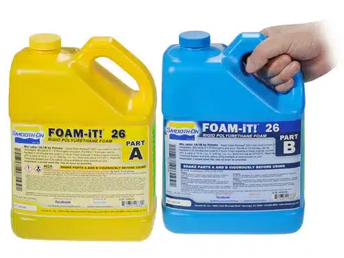 Smooth-On’s FOAM-iT!™ Series are two-component water blown rigid foams that are versatile and easy to use. FOAM-iT!™ products are available in 3lb., 4 lb., 5 lb., 8 lb., 10 lb.,15 lb. or 26 lb. per cubic foot densities. Parts A and B are measured and mixed in equal amounts by volume. The mixture is then poured into a mold or other form (apply release agent if necessary). The mixture will expand many times original volume (depending on which FOAM-iT!™ product you are using) and develop a uniform cell structure. FOAM-IT!™ 26 is tack-free in about 4 – 6.5 minutes, developing handling strength in 20 minutes and full cure in 2 hours. FOAM-iT!™ 26 can be cast in blocks as a machinable prototype modeling board.