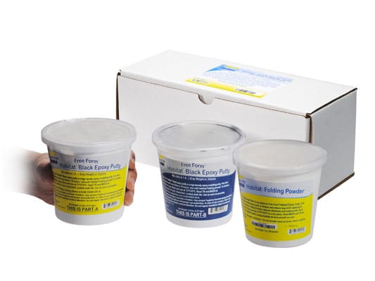 Free Form™ Habitat™ Black Epoxy Putty is a mix-by-hand putty that is used to create textured or highly detailed display pieces. Habitat™ Black is solvent-free and contains no VOC’s. Working time is 60 minutes and cure time is 16 hours at room temperature (73°F/23°C). Epoxy cures to a very hard, heat resistant material that is easily painted.
