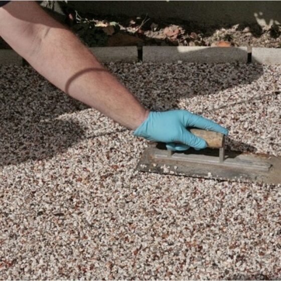Resin Bound – Add the gravel and mixed resin at a ratio of 1 part mixed material to 13 parts gravel in a mechanical mixer for 5 minutes. When fully mixed empty the contents into a barrow and apply to the area, rake, tamp and trowel smooth as required.
