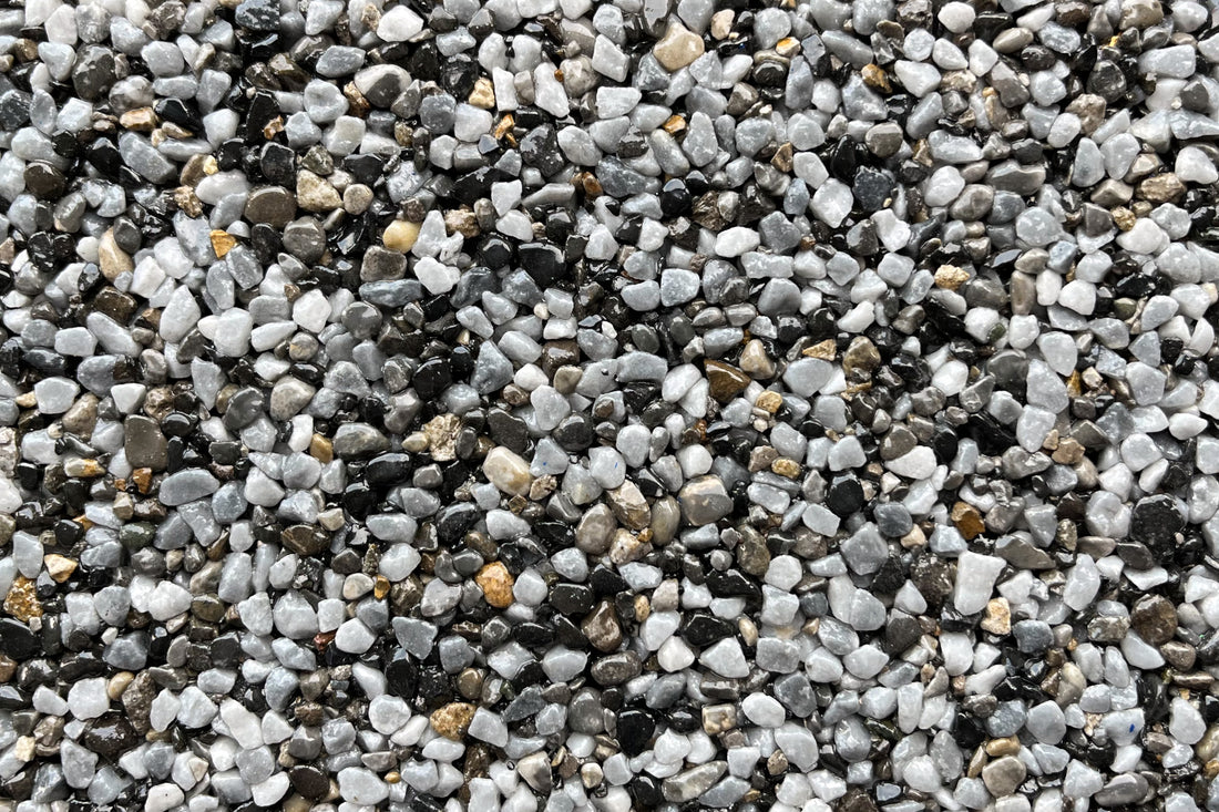 A 25kg bag of Gunmetal Quartz 1-3mm, washed and dried aggregate. A slightly more grey and and varied blend to black alternatives such as Ocean Grey and also similar to Peak Grey. A very easy aggregate to compact.