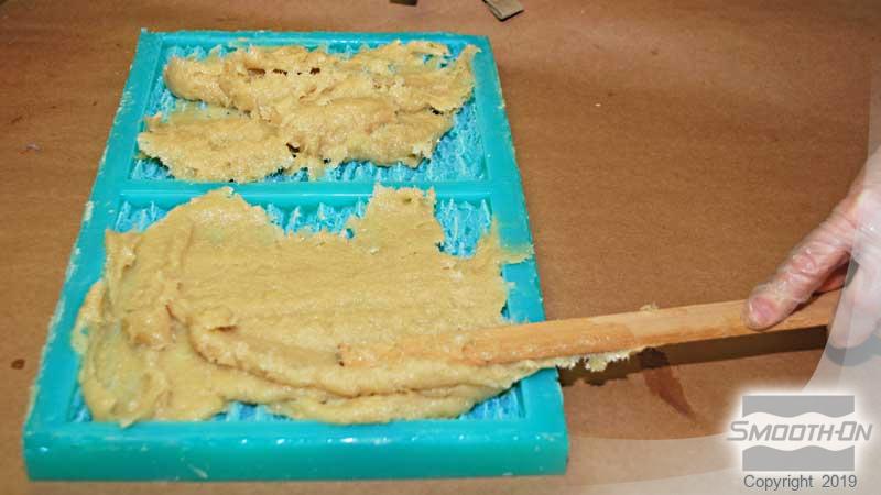Applying – Mixed material thickens quickly and pot life is limited. Do not delay between mixing and applying. To increase working time, spread entire container contents over rubber mold surface and cover and spread mixture to uncovered areas. Apply uniformly with spatula over mold surface. Material will adhere to itself if additional layers are needed. Apply at least 3/8” (1 cm) thickness, making sure rubber mold is thoroughly covered. For maximum strength and heat resistance, ½” (1.27 cm) thickness is recommended. Large molds may require added thickness for support shell stability. Supports (wood or metal) may be embedded for added stability and handling. Prevent a jagged surface; Final layer of Plasti-Paste™ II can be smoothed by wiping solvent (denatured alcohol or acetone) onto surface with gloved hand.