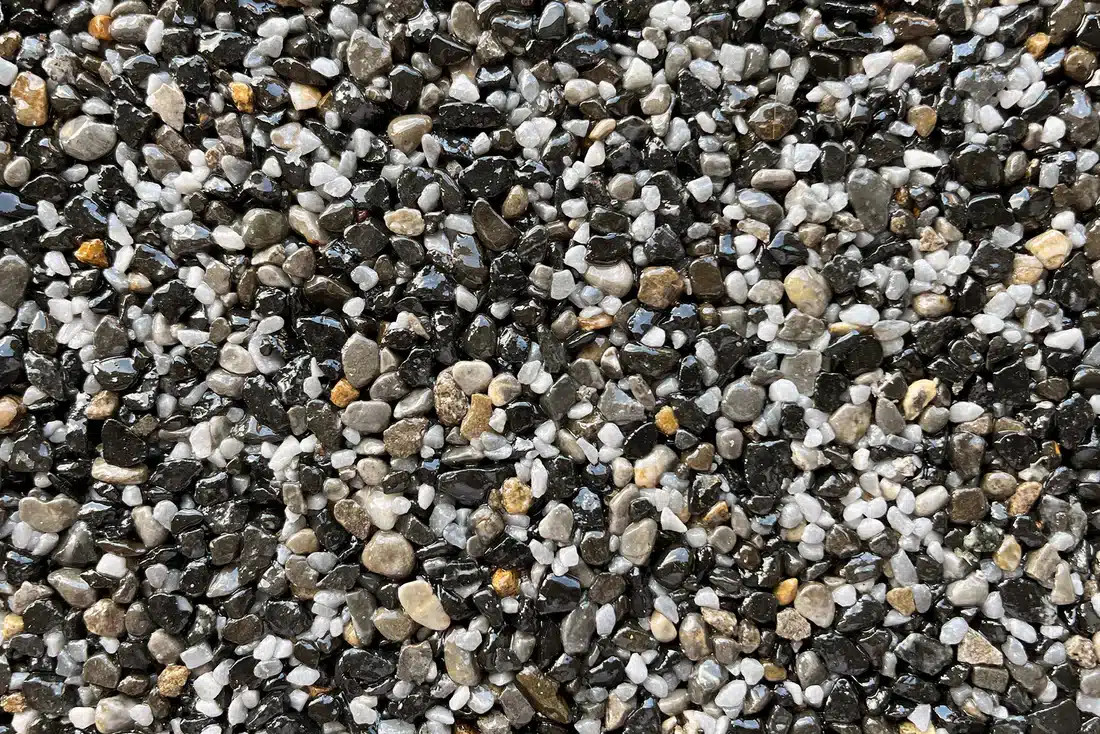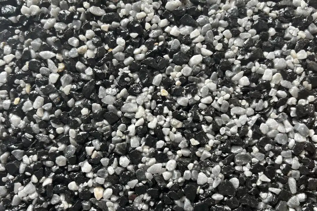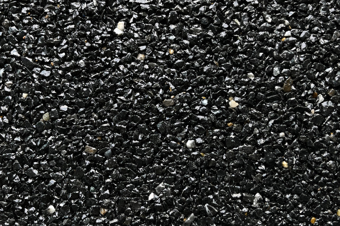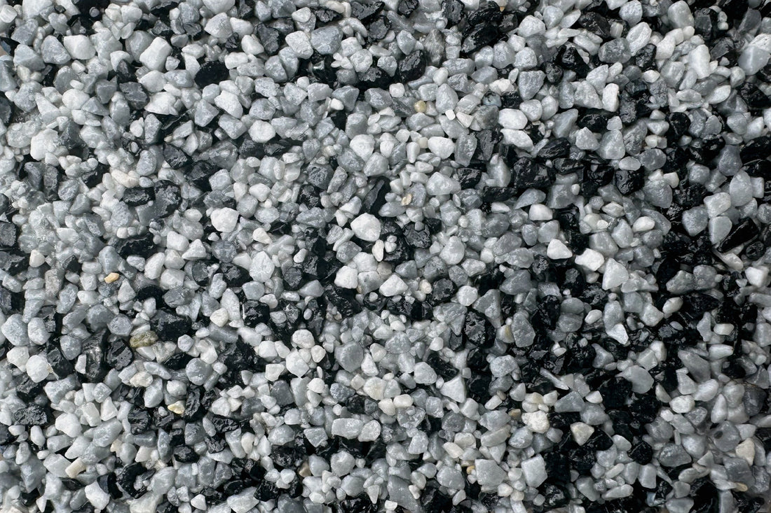 A 25kg bag of Raven Steel 2-5mm, washed and dried aggregate. A strong black quartz with a slight twist of Silver, a very deep colour that replaces Black Basalt.