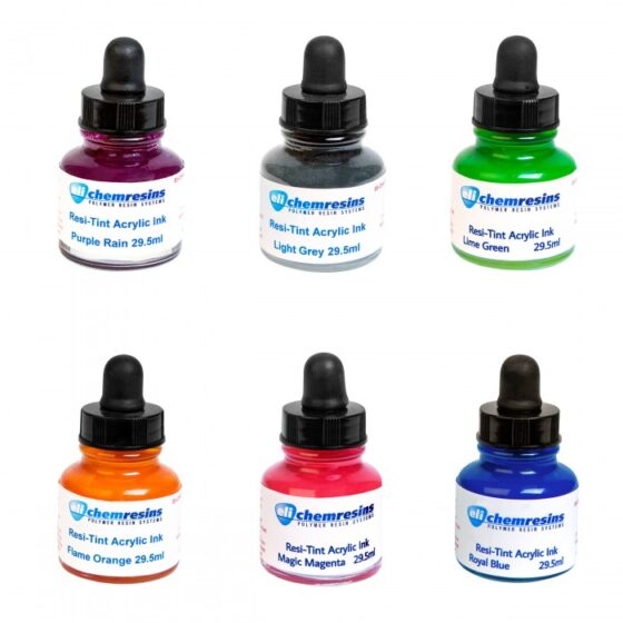 resi-TINT bottles come with an integrated glass dropper so you control the amount of colour you want. The tints have a much improved resistance to fading than conventional dyes and colouring agents, they are water resistant too. The range of 18 colours have either a 3 or 4 star rating for permanence. Such a high degree of colour fastness over such a range of fully inter-mixable colours makes them ideal for use by artists in the production of paintings/sculptures for permanent display.