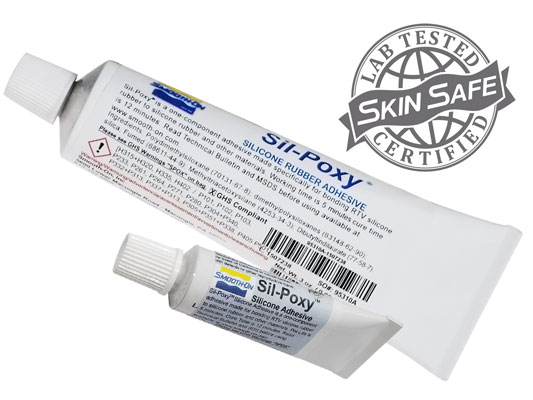 Sil-Poxy™ can be used for repairing torn silicone rubber molds. Other applications include bonding of silicone for prosthetics and animatronics. Cured Sil-Poxy™ is certified skin safe. IMPORTANT – Do not apply to skin in liquid form.