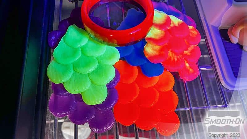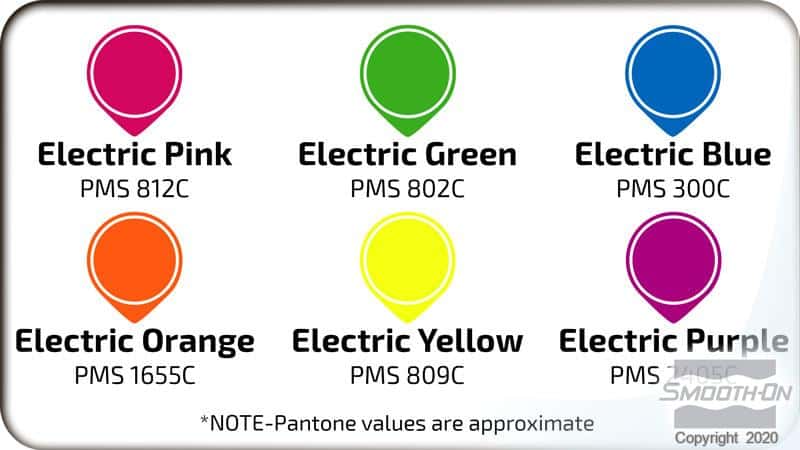 Silc Pig™ Electric Fluorescent Pigments are concentrated, so a little goes a long way when coloring Smooth-On silicone products. Recommended loading range is .001% to 3% of total silicone system weight. Do not overload silicone rubber with Silc Pig™ Electric Fluorescent Pigments or cure inhibition may occur. Pre-mix Silc Pig™ Electric Fluorescent Pigment in container thoroughly before dispensing as settling may have occurred. Add Silc Pig™ Electric Fluorescent Pigment to the Part A side of the silicone rubber system and mix well before adding Part B.