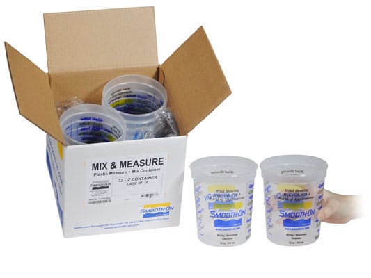 Plastic mixing containers with graduated markings for accurate measurement of materials which are measured by volume.