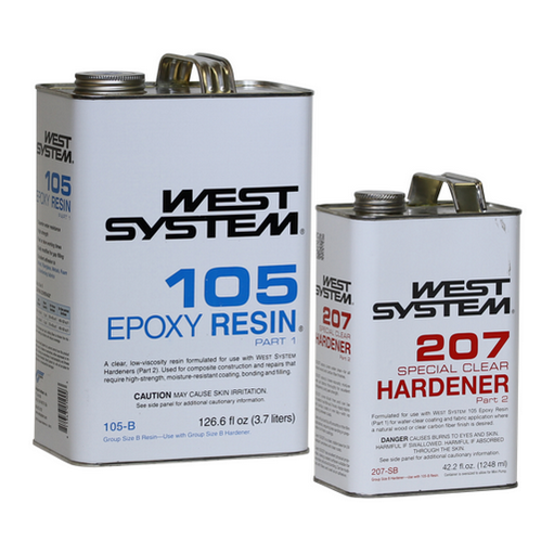 105 Resin is designed specifically to cover and bond with wood fibre, fiberglass, reinforcing fabrics and a variety of metals when mixed at the proper ratio with a West System hardener. An excellent adhesive, 105 mixtures will bridge gaps and fill voids when modified with West System fillers and can be sanded and shaped when cured. With roller applications, it has excellent thin-film characteristics to flow out and self-level without fish eyeing.105 Resin/207 Hardener mixtures cure clear so you can achieve a natural finish when coating with varnish.