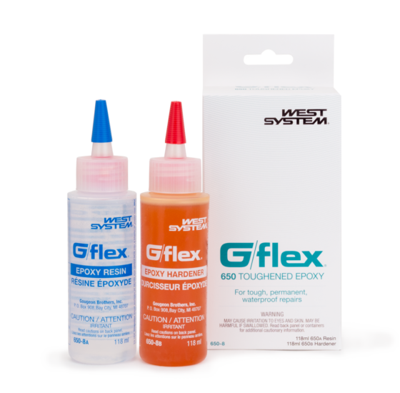 G/flex® 650 is a toughened, versatile, liquid epoxy for permanent waterproof bonding of fiberglass, ceramics, metals, plastics, and damp and difficult-to-bond woods. It is a bit more flexible than standard epoxies and polyester but much stiffer than adhesive sealants. This gives it the ability to make structural bonds that can absorb the stress of expansion, contraction, shock, and vibration. It is ideal for bonding dissimilar materials. It can be modified with WEST SYSTEM® fillers and additives and used to wet out fiberglass tapes and fabrics. This system is simple to use with its 1:1 mix ratio by volume.