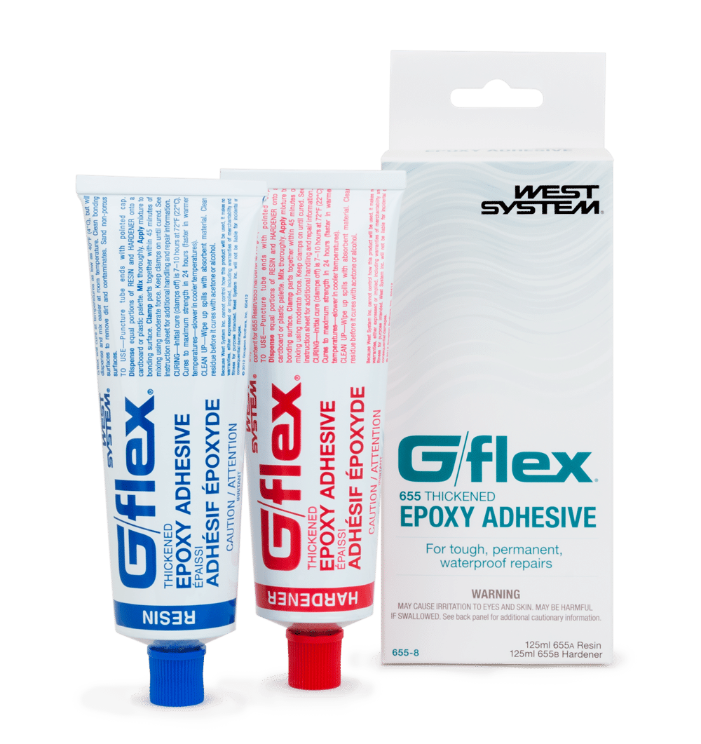 G/flex Thickened Epoxy Adhesive is a toughened, versatile, 2-part epoxy for permanent waterproof bonding of plastic, fibreglass, ceramics, metals, damp, and difficult-to-bond woods. G/flex 655 is a bit more flexible than standard epoxies and polyester but much stiffer than adhesive sealants. This gives G/flex 655 the ability to make structural bonds that can absorb the stress of expansion, contraction, shock, and vibration. It is ideal for bonding dissimilar materials.